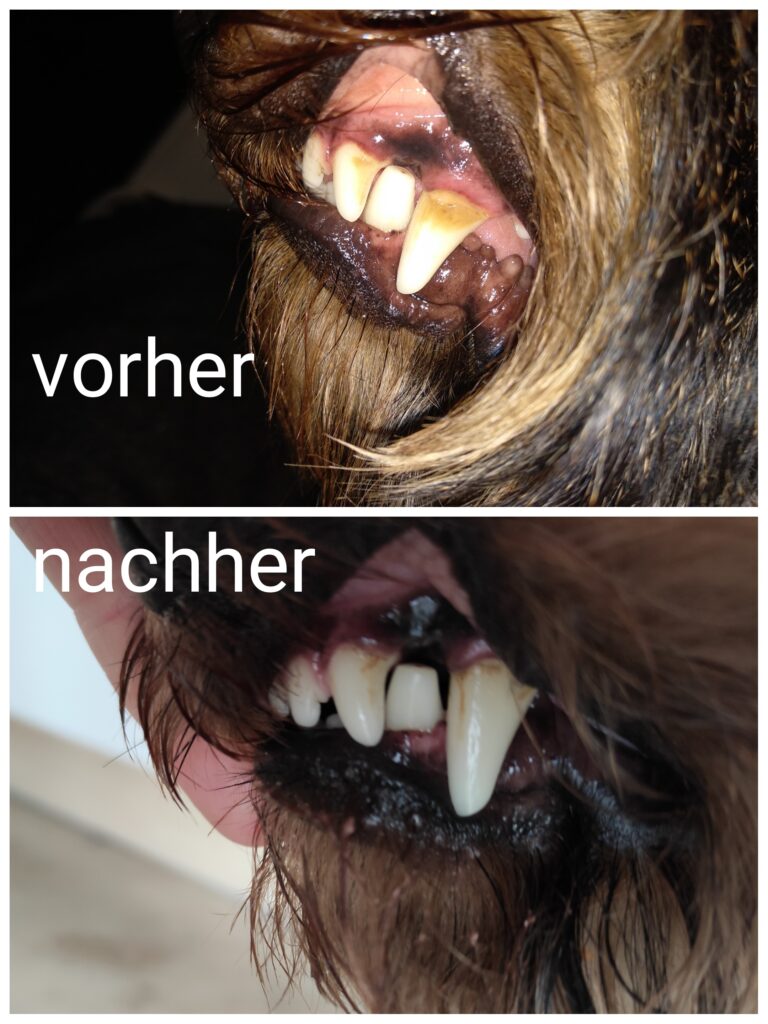 Da das Hundefutter und vorallem die Snacks immer mehr versteckten Zucker beinhalten, werden die Zähne angegriffen und vorallem das Zahnfleisch nicht gut versorgt. Wir entdecken gelben Belag oder hartnäckigen Dreck in den Zahnzwischenräumen. Und der fiese Maulgeruch kommt dazu.